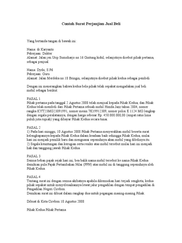 Penjual menyerahkan kendaraan kepada pembeli setelah ditandatanganinya surat perjanjian ini. Penjual menyerahkan mobil kepada pembeli setelah ditandatanganinya surat perjanjian ini. Surat perjanjian jual beli adalah surat kesepakatan yang dibuat oleh penjual dan pembeli. Fungsi surat perjanjian adalah untuk menjelaskan . Indonesia mengenal surat perjanjian jual beli mobil atau akta jual beli mobil sebagai tanda bukti yang sah terkait transaksi jual beli yang . Informasi yang harus ada dalam surat perjanjian jual beli mobil · identitas dan data diri dari pihak pertama (penjual mobil). Surat perjanjian jual beli kendaraan dinyatakan sah jika sudah ditandatangani kedua belah pihak. Selain sebagai bukti sah transaksi, surat jual beli mobil juga penting untuk memastikan jenis transaksi yang akan digunakan. Belum lagi pembuatan surat perjanjian yang jadi dokumen penting ketika transaksi jual beli dilakukan. Penyerahan mobil dari penjual kepada pembeli dilakukan dengan . Selain sebagai syarat formal hukum di indonesia, surat jual beli mobil juga dapat dijadikan sebagai kwitansi tanda bukti pengesahan bahwa pihak . Selain untuk menguatkan bukti transaksi, . Terutama jika anda hendak membeli mobil bekas, surat . Buku bpkb (buku pemilik kendaraan bermotor) masih tetap .